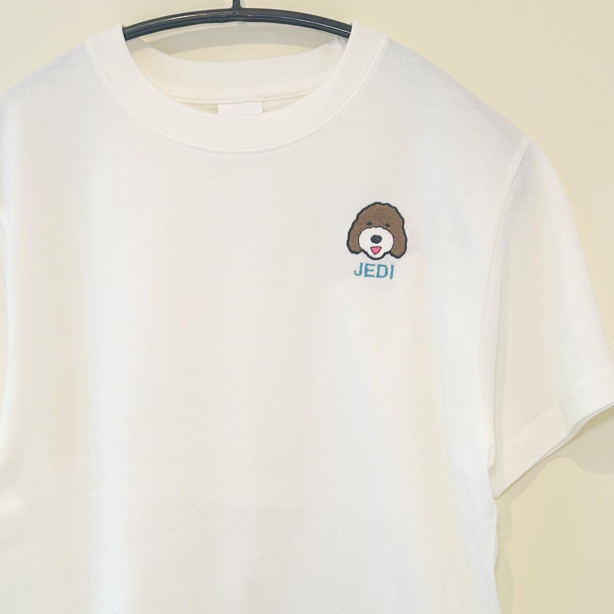 似顔絵ドッグチャームでお馴染みの「わんちゃんの似顔絵の刺繍」が、胸のあたりに少し大きめのワンポイント刺繍として入ります。
