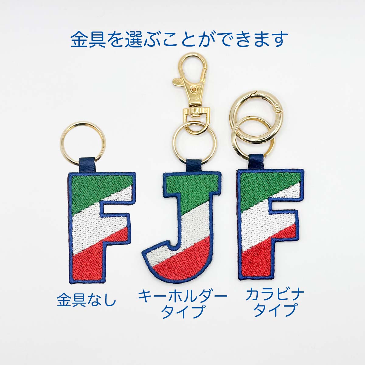 イラストレーターによる手書きのアルファベットを、トリコロールカラーの両面刺繍のチャームに仕立てました。