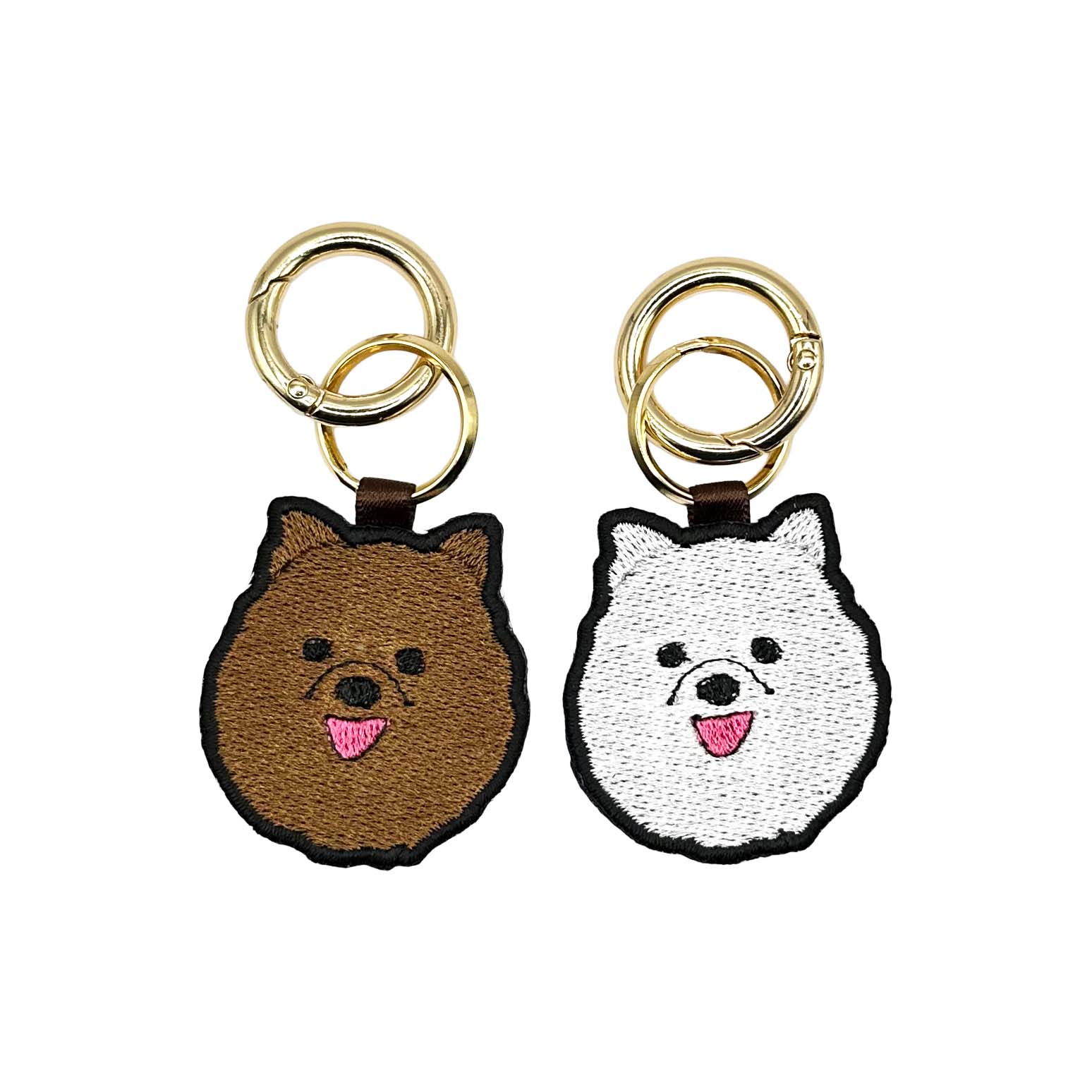 両面刺繍の愛らしいドッグチャーム、刺繍チャームはとても軽量で、首輪に付けたり、ハーネスに取り付けたり、リードの接続部分に取り付けたりと、様々な使い方ができます。お散歩バッグのチャームにも使えます。